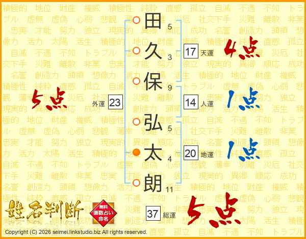 田(5画)久(3画)保(9画) 弘(5画)太(4画)朗(11画)