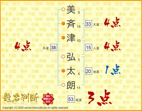 美(9画)斉(14画)津(10画) 弘(5画)太(4画)朗(11画)