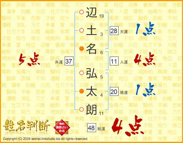 辺(19画)土(3画)名(6画) 弘(5画)太(4画)朗(11画)
