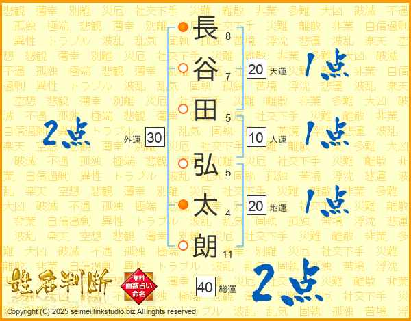 長(8画)谷(7画)田(5画) 弘(5画)太(4画)朗(11画)
