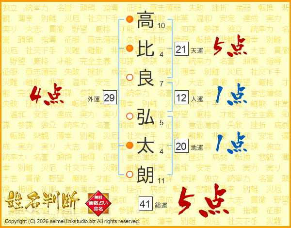 高(10画)比(4画)良(7画) 弘(5画)太(4画)朗(11画)