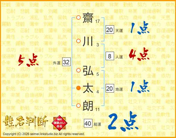 齋(17画)川(3画) 弘(5画)太(4画)朗(11画)