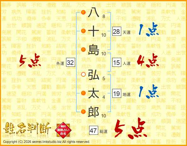 八(8画)十(10画)島(10画) 弘(5画)太(4画)郎(10画)