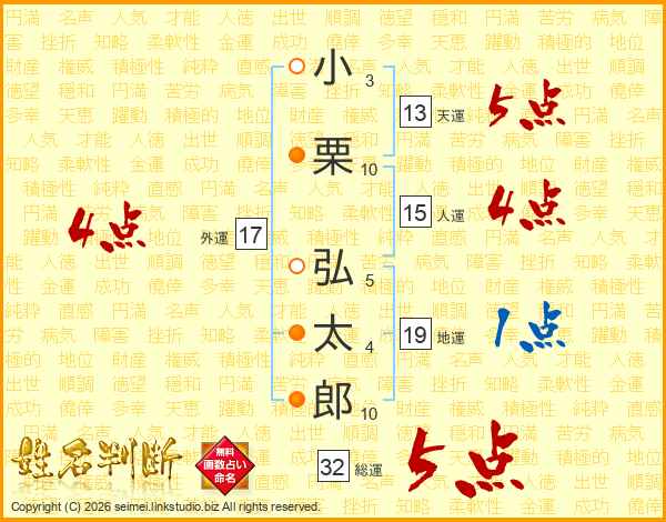小(3画)栗(10画) 弘(5画)太(4画)郎(10画)