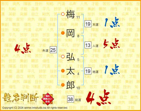 梅(11画)岡(8画) 弘(5画)太(4画)郎(10画)