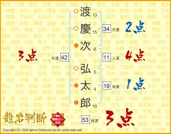 渡(13画)慶(15画)次(6画) 弘(5画)太(4画)郎(10画)