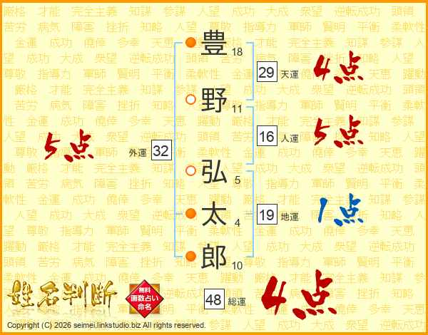 豊(18画)野(11画) 弘(5画)太(4画)郎(10画)