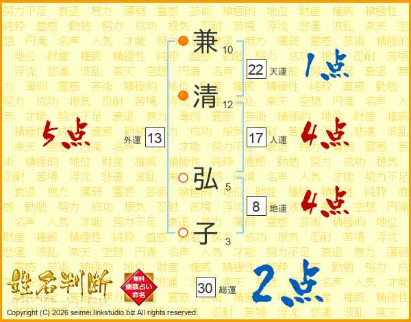 兼(10画)清(12画) 弘(5画)子(3画)