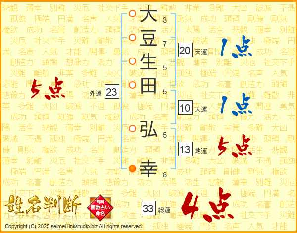 大(3画)豆(7画)生(5画)田(5画) 弘(5画)幸(8画)