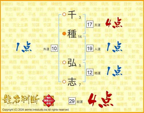 生活面を象徴する運勢です。外部から受ける影響力を表し、結婚運、家庭運や職場、環境への順応性を表します。総運から人運を引いた画数。姓や名が1文字の場合を除く。