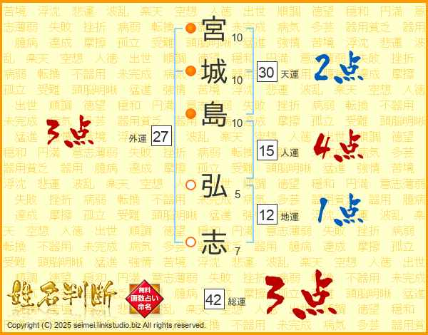 宮(10画)城(10画)島(10画) 弘(5画)志(7画)
