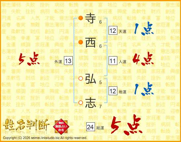 寺(6画)西(6画) 弘(5画)志(7画)
