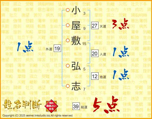 小(3画)屋(9画)敷(15画) 弘(5画)志(7画)