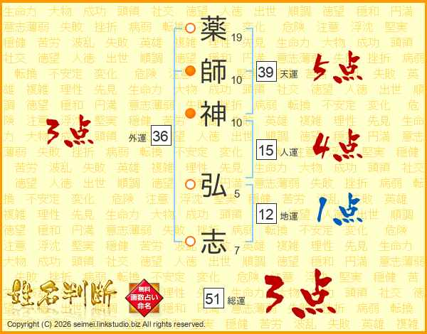 薬(19画)師(10画)神(10画) 弘(5画)志(7画)