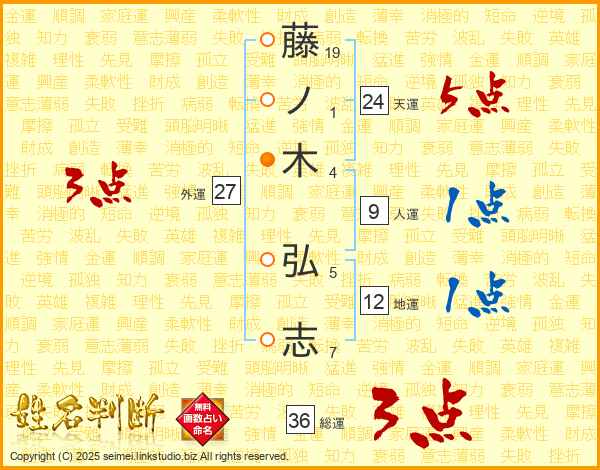 藤(19画)ノ(1画)木(4画) 弘(5画)志(7画)