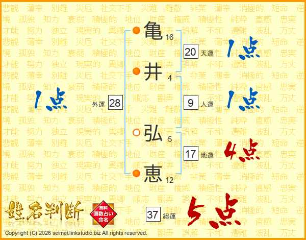 亀(16画)井(4画) 弘(5画)恵(12画)