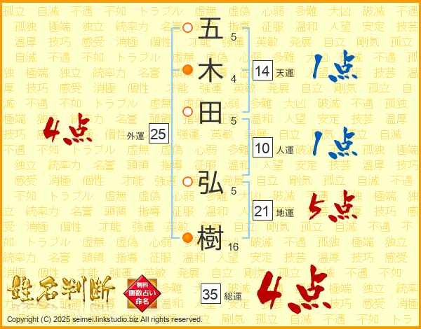 五(5画)木(4画)田(5画) 弘(5画)樹(16画)