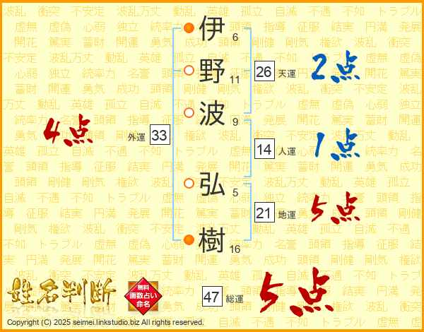 伊(6画)野(11画)波(9画) 弘(5画)樹(16画)