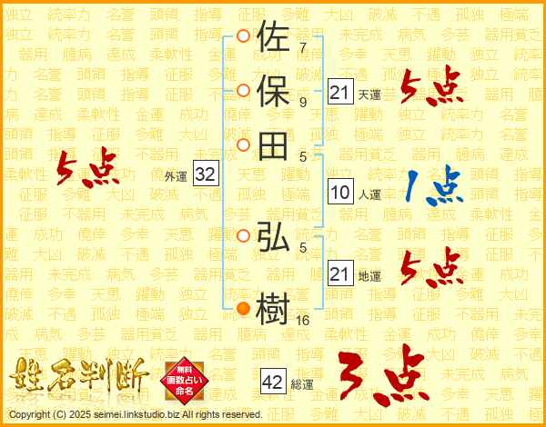 佐(7画)保(9画)田(5画) 弘(5画)樹(16画)
