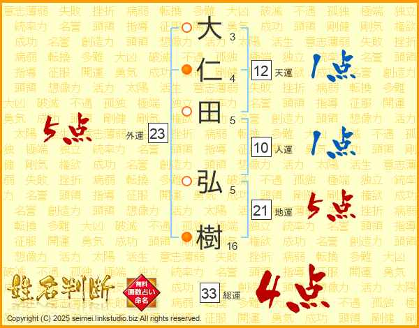大(3画)仁(4画)田(5画) 弘(5画)樹(16画)