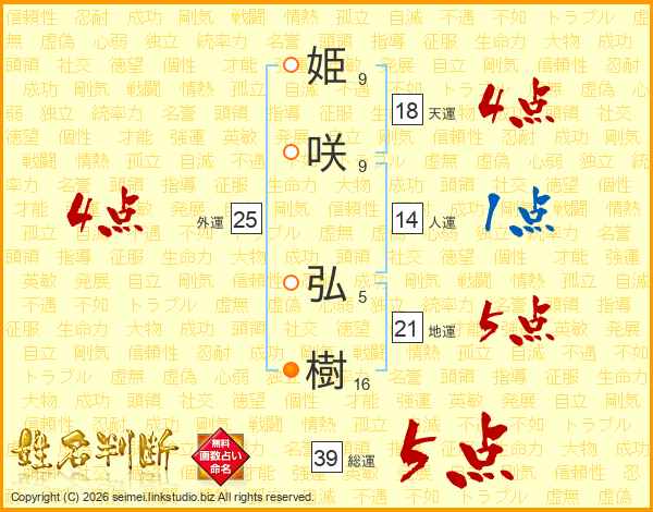 姫(9画)咲(9画) 弘(5画)樹(16画)