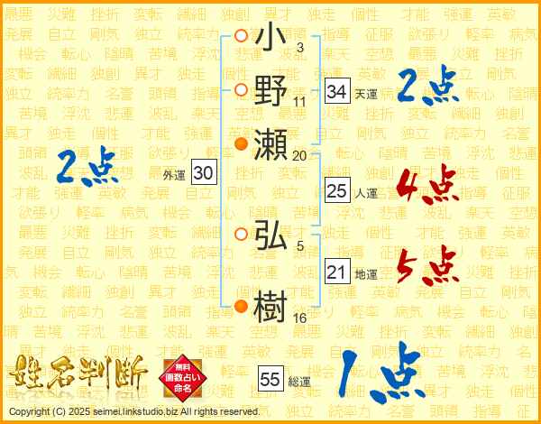 小(3画)野(11画)瀬(20画) 弘(5画)樹(16画)