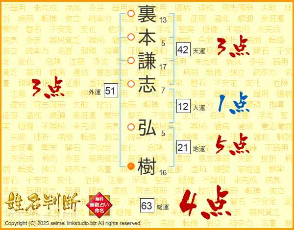 裏(13画)本(5画)謙(17画)志(7画) 弘(5画)樹(16画)