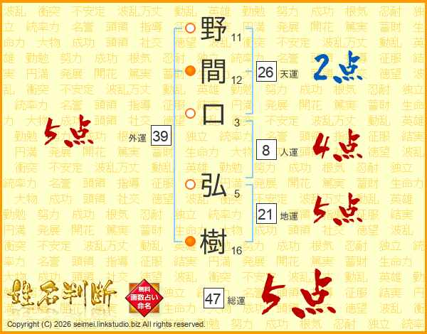 野間口弘樹さんの総運は47画の5点!