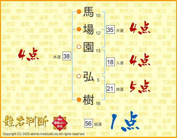 馬(10画)場(12画)園(13画) 弘(5画)樹(16画)
