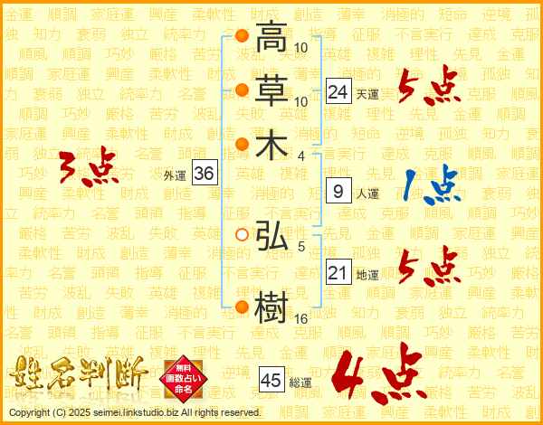 高(10画)草(10画)木(4画) 弘(5画)樹(16画)