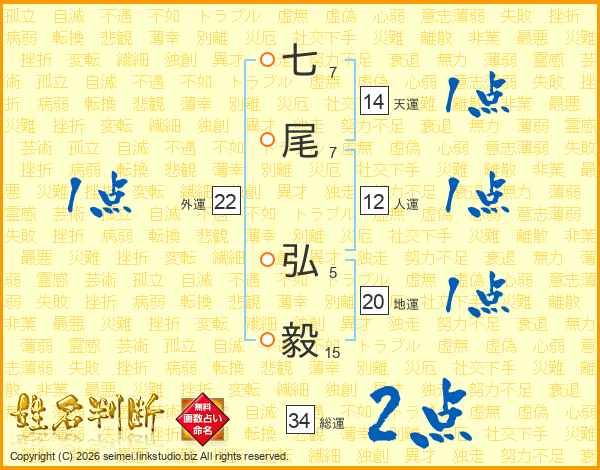 七(7画)尾(7画) 弘(5画)毅(15画)