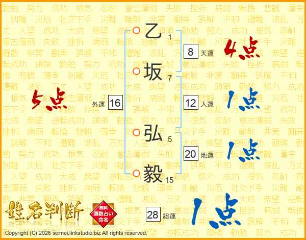 乙(1画)坂(7画) 弘(5画)毅(15画)