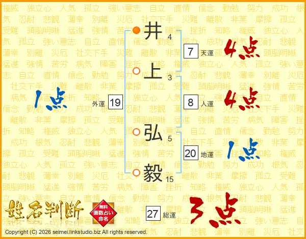 生活面を象徴する運勢です。外部から受ける影響力を表し、結婚運、家庭運や職場、環境への順応性を表します。総運から人運を引いた画数。姓や名が1文字の場合を除く。