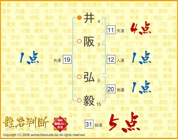井(4画)阪(7画) 弘(5画)毅(15画)