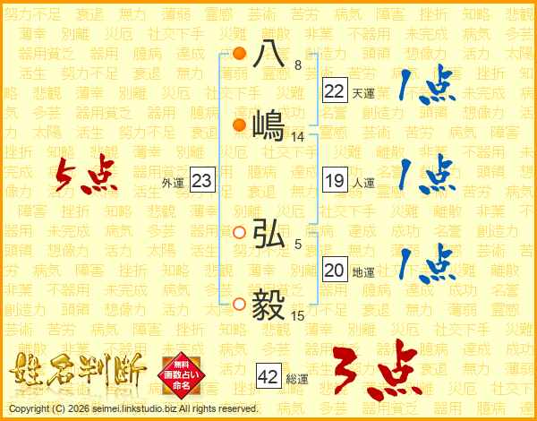 八(8画)嶋(14画) 弘(5画)毅(15画)
