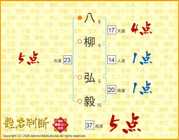 八柳弘毅さんの総運は37画の5点!