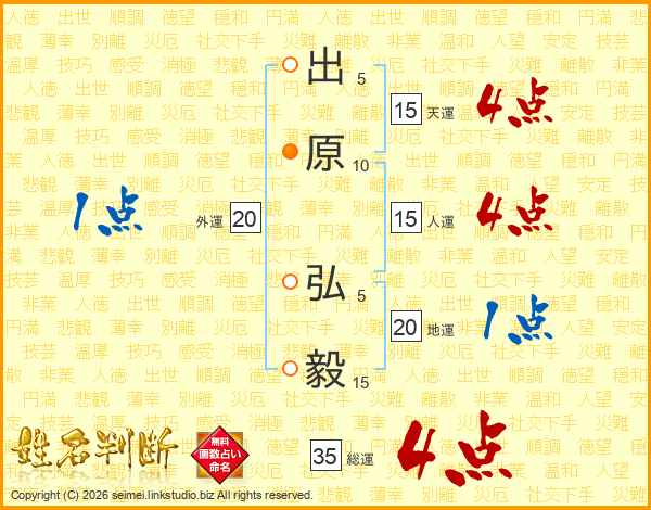 生活面を象徴する運勢です。外部から受ける影響力を表し、結婚運、家庭運や職場、環境への順応性を表します。総運から人運を引いた画数。姓や名が1文字の場合を除く。