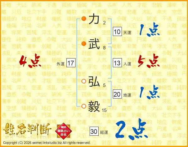 生活面を象徴する運勢です。外部から受ける影響力を表し、結婚運、家庭運や職場、環境への順応性を表します。総運から人運を引いた画数。姓や名が1文字の場合を除く。
