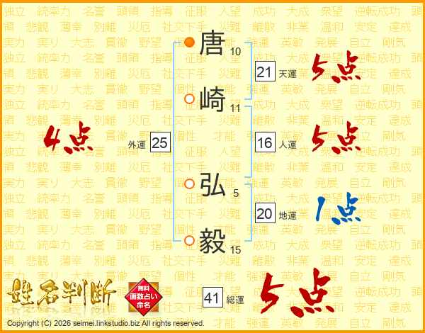 唐(10画)崎(11画) 弘(5画)毅(15画)