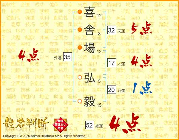 喜(12画)舎(8画)場(12画) 弘(5画)毅(15画)