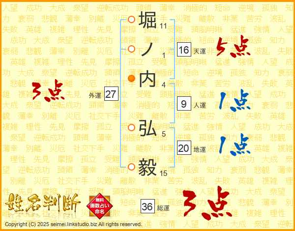 堀(11画)ノ(1画)内(4画) 弘(5画)毅(15画)