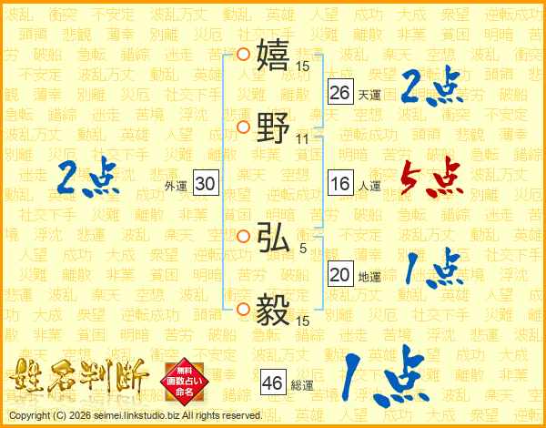 嬉(15画)野(11画) 弘(5画)毅(15画)