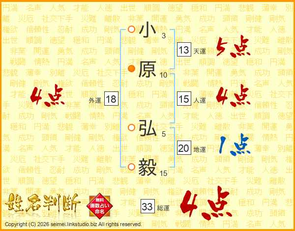 生活面を象徴する運勢です。外部から受ける影響力を表し、結婚運、家庭運や職場、環境への順応性を表します。総運から人運を引いた画数。姓や名が1文字の場合を除く。