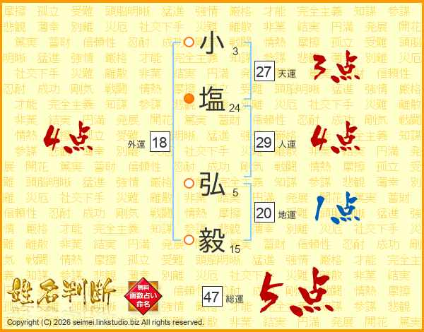 小(3画)塩(24画) 弘(5画)毅(15画)