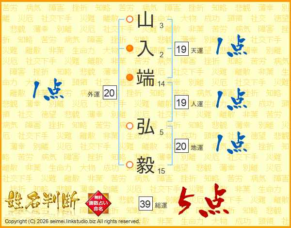 山(3画)入(2画)端(14画) 弘(5画)毅(15画)