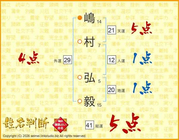 嶋(14画)村(7画) 弘(5画)毅(15画)