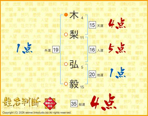 木(4画)梨(11画) 弘(5画)毅(15画)