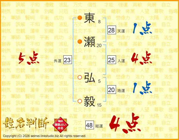 東(8画)瀬(20画) 弘(5画)毅(15画)