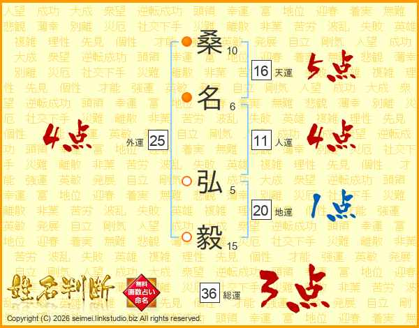 桑(10画)名(6画) 弘(5画)毅(15画)