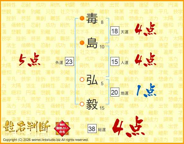 毒(8画)島(10画) 弘(5画)毅(15画)
